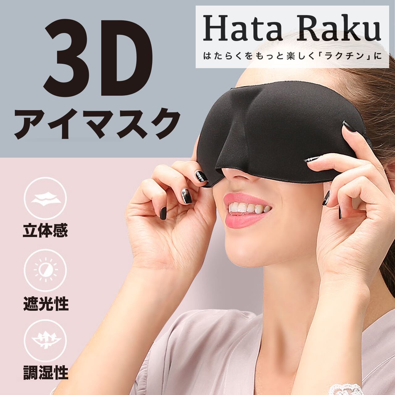 HataRakuの3D立体アイマスクは、快適な睡眠環境を提供するために設計されています。独自の立体構造により、目の周りに圧迫感を与えず、自然な寝顔を保ちながらしっかりと光を遮ります。通気性に優れた素材を使用しているため、長時間の使用でも快適に過ごせます。快眠を求めるあなたに、ぜひお試しいただきたいアイテムです。深い眠りへと誘う、心強いパートナーとなることでしょう。
